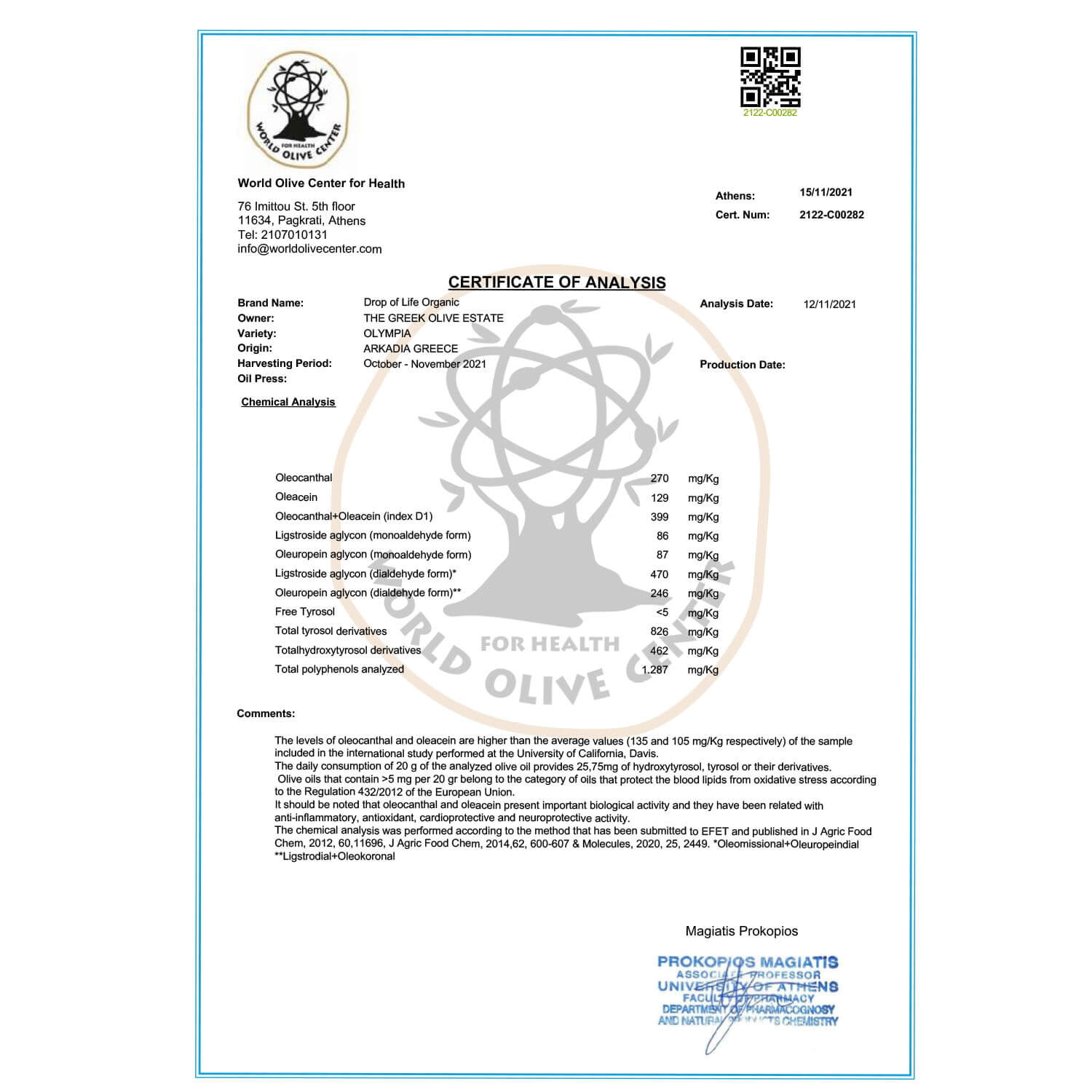 This well-balanced early harvest Greek organic olive oil has a fresh grassy aroma, medium fruitiness, and a lingering, pleasantly bitter and spicy flavor. Furthermore, it is a high-phenolic extra virgin olive oil, qualifying for the EU health claim on olive oil polyphenols. Therefore, consuming just 20 grams (about two tablespoons) daily offers significant health benefits.