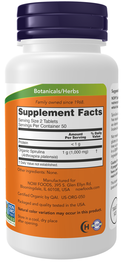 Certified Organic Spirulina 500 mg supports daily nutrition naturally.