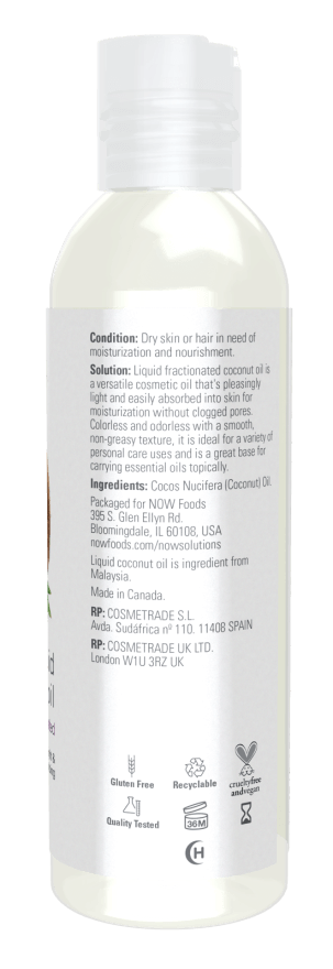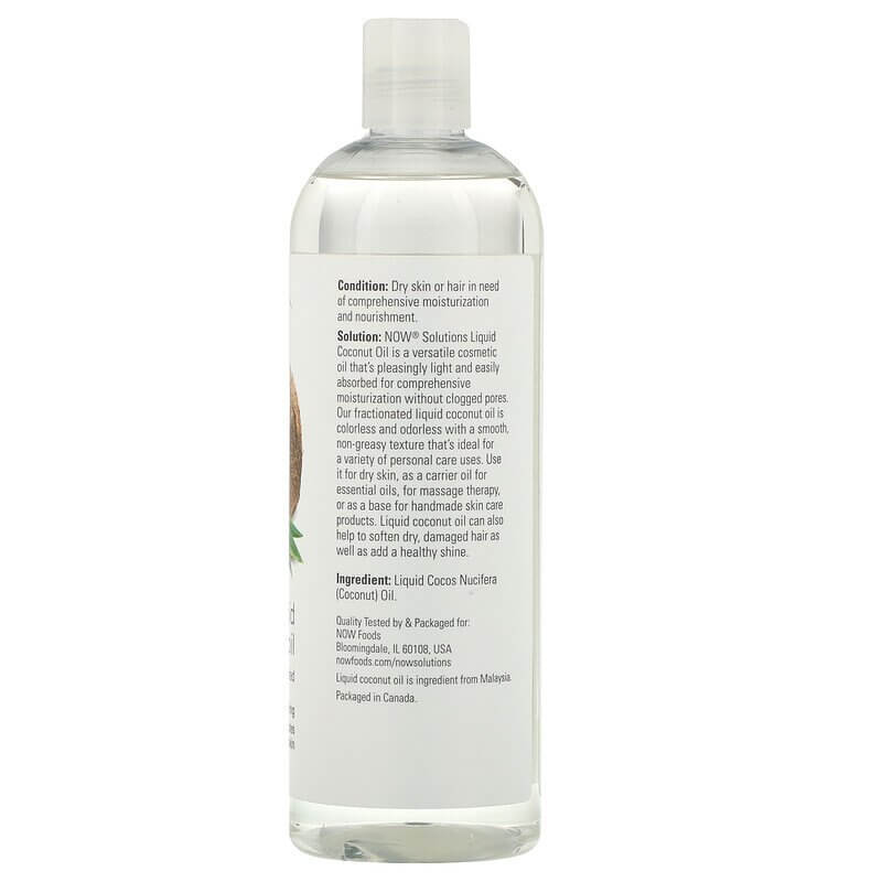 Solution: NOW® Solutions Liquid Coconut Oil is a versatile cosmetic oil that’s pleasingly light and easily absorbed for comprehensive moisturization without clogged pores. Our fractionated Liquid Coconut Oil is colorless and odorless with a smooth, non-greasy texture that’s ideal for a variety of personal care uses. Use it for dry skin, as a carrier oil for essential oils, for massage therapy, or as a base for handmade skin care products. Liquid Coconut Oil can also help to soften dry, damaged hair as well as add a healthy shine.
